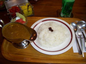 チーズカレーをオーダー。 日本のカレー。食べやすくておいしいよ。 チーズ、ルーの上に乗っているかと思いきや、中にインでした。 そのせいか甘め。。。。 連れのビーフカレーを食べさせてもらったけど、そっちのが好きかも。 ルーの色は、茶→黒の中間くらい。ちょい辛さアリ。 ご飯の量は多いので、少なめ(−30円)で女子には十分。 ご飯をカレーでビシャビシャにして食べる派なので、 それでもご飯が残ってしまうのよ。 ……だったら、食べ方変えよーよ。 いや、でも、ビシャビシャ派なので。 タムラさんもビシャビシャ派だったりして☆ |